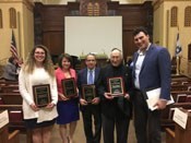 Sen. Gayle L. Goldin (D-Dist. 3, Providence), Rep. Katherine S. Kazarian (D-Dist. 63, East Providence), Sen. Joshua Miller (D-Dist. 28, Cranston, Providence) and former representative Aaron Regunberg of Providence were presented the Never Again award to honor their effort to ensure future generations learn about the atrocities of the past so they will not be repeated.
